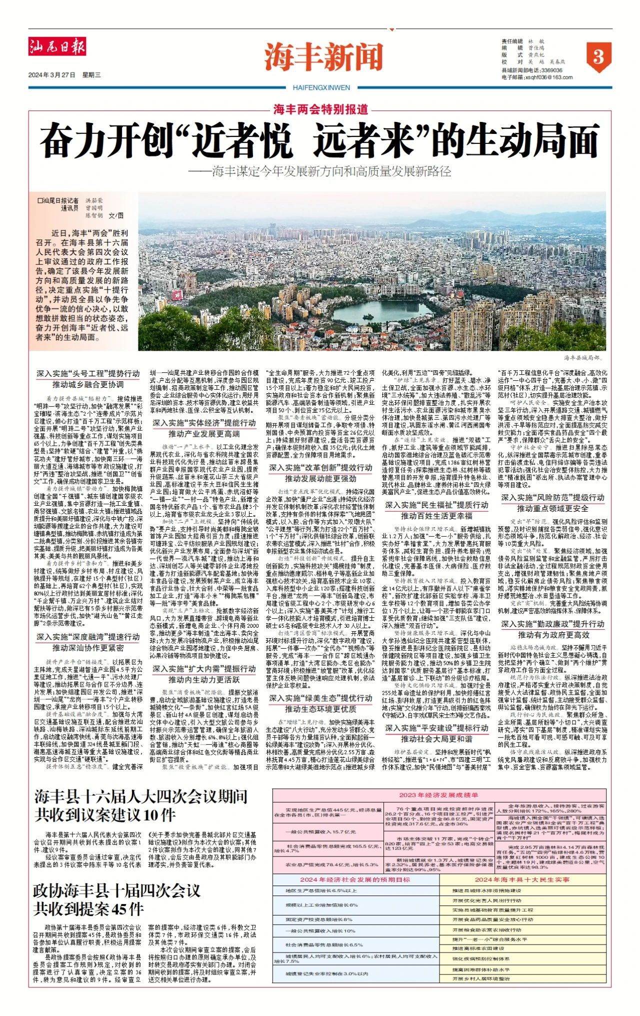 近日,海丰“两会”胜利召开。在海丰县第十六届人民代表大会第四次会议上审议通过的政府工作报告,确定了该县今年发展新方向和高质量发展的新路径,决定重点实施“十提行动”,并动员全县以争先争优争一流的信心决心,以敢想敢拼敢担当的状态姿态,奋力开创海丰“近者悦、远者来”的生动局面。