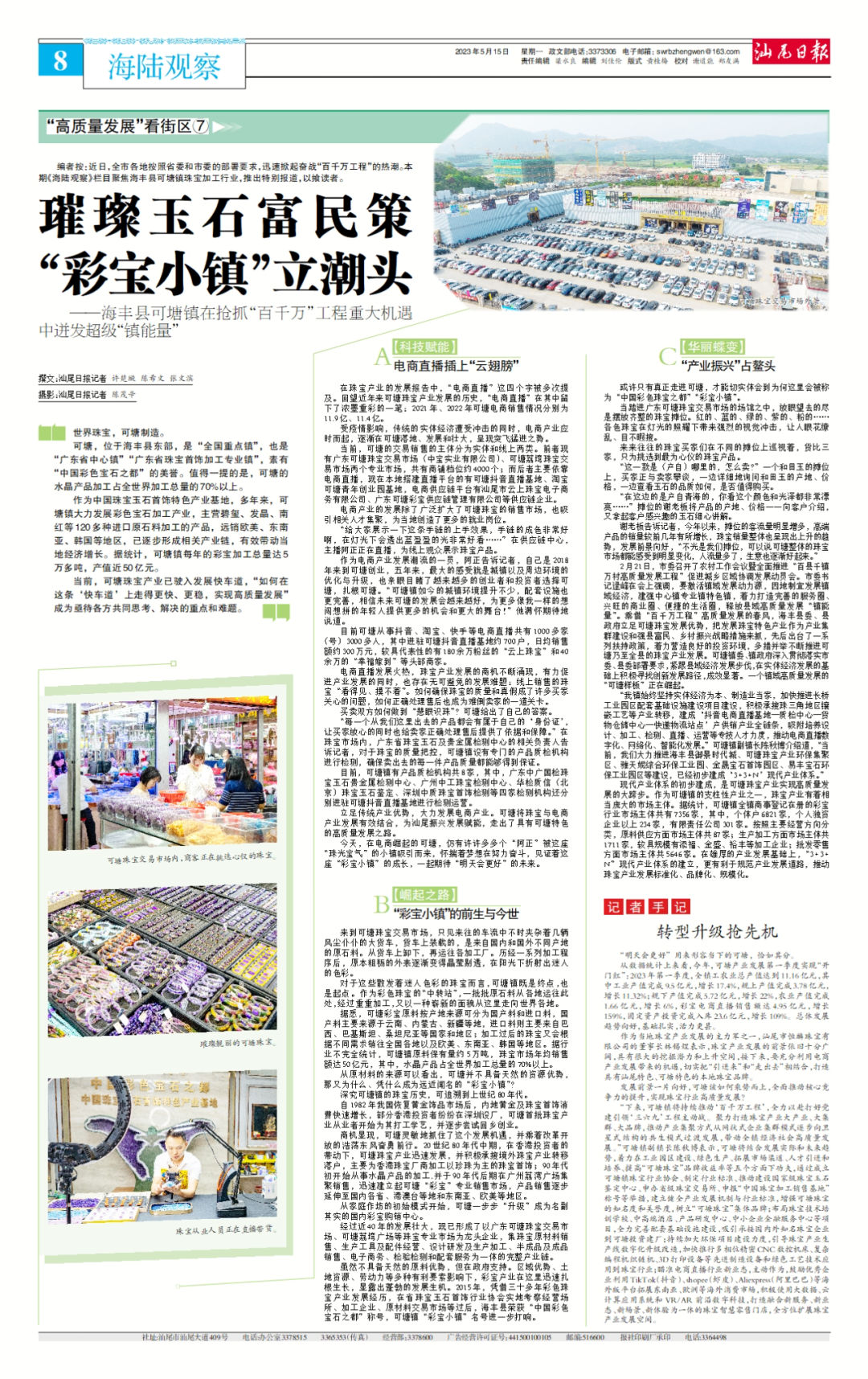 编者按:近日,全市各地按照省委和市委的部署要求,迅速掀起奋战“百千万工程”的热潮。本期《海陆观察》栏目聚焦海丰县可塘镇珠宝加工行业,推出特别报道,以飨读者。