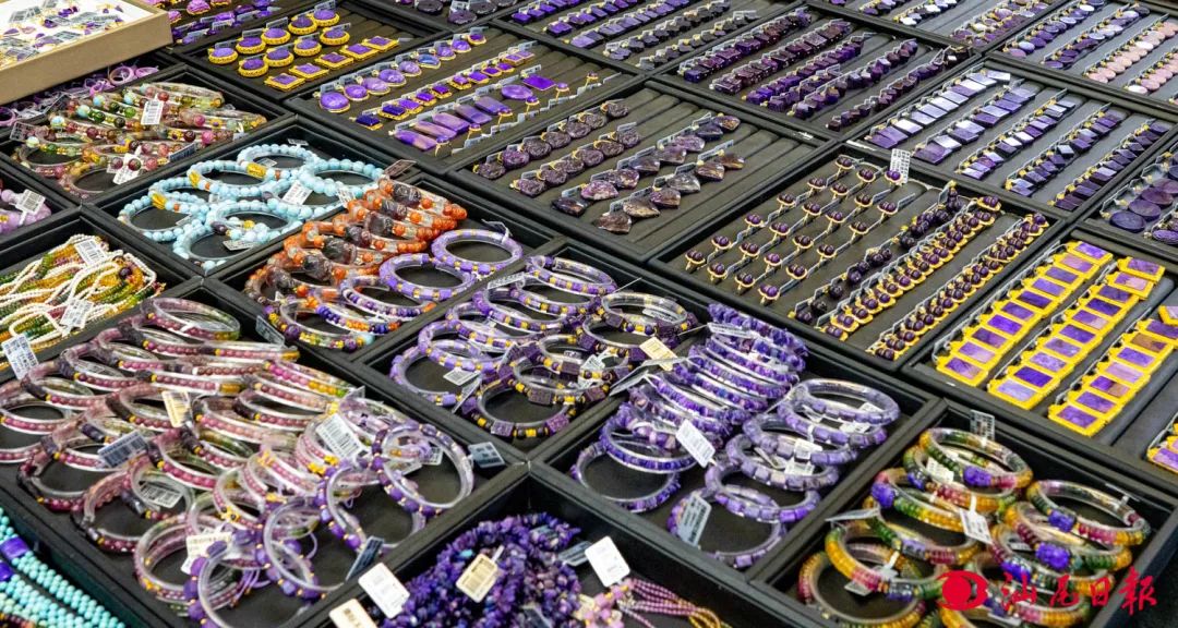 当踏进广东可塘珠宝交易市场的场馆之中,放眼望去的尽是摆放齐整的珠宝摊位。红的、蓝的、绿的、紫的、粉的……各色珠宝在灯光的照耀下带来强烈的视觉冲击,让人眼花缭乱、目不暇接。