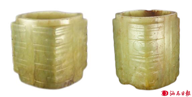 考古专家认为,玉琮是我国新石器时代晚期良渚文化的遗物,有“礼治、享后、敛尸、随葬”等多种用途。据练娟介绍,在田墘出土玉琮的玉料与良渚文化玉琮的玉料有所不同,良渚文化玉琮的玉料为鸡骨玉,田墘出土玉琮为岫岩软玉料,其产地在北方辽宁一带。玉琮呈淡黄绿色,方柱体状,外方内圆。饰抽象兽面纹和细密云雷纹,这两件玉琮从其形制、纹饰来看,具有良渚文化特征,而玉质、线条、图纹等创作艺术超越了良渚,是长江中下游良渚文化向岭南传播且艺术水平达到巅峰期的物证。