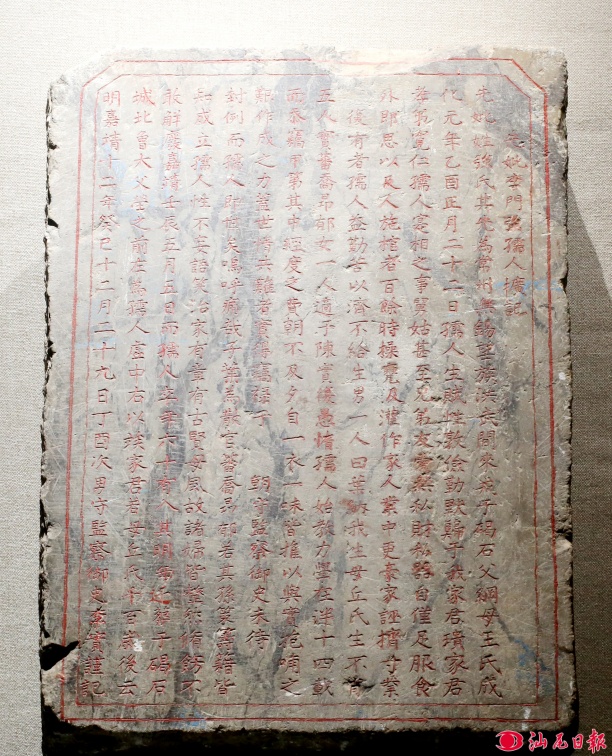 在汕尾市博物馆展厅的一隅竖立着一方石碑,该碑长约60厘米、宽约40厘米、厚约15厘米,由青石打制,碑文约500字,小楷直书阴刻,题为“先妣李门强孺人摭记”落款“明嘉靖十二年癸巳十二月二十九日丁酉次男守监察御史李实谨记”。该碑于上世纪八十年代在陆丰碣石城北出土,是明嘉靖进士李实为其母撰写的墓志。就该墓志透露了什么历史信息,它为什么会如此重要,被展示在博物馆等问题,记者采访了市博物馆馆长练娟。