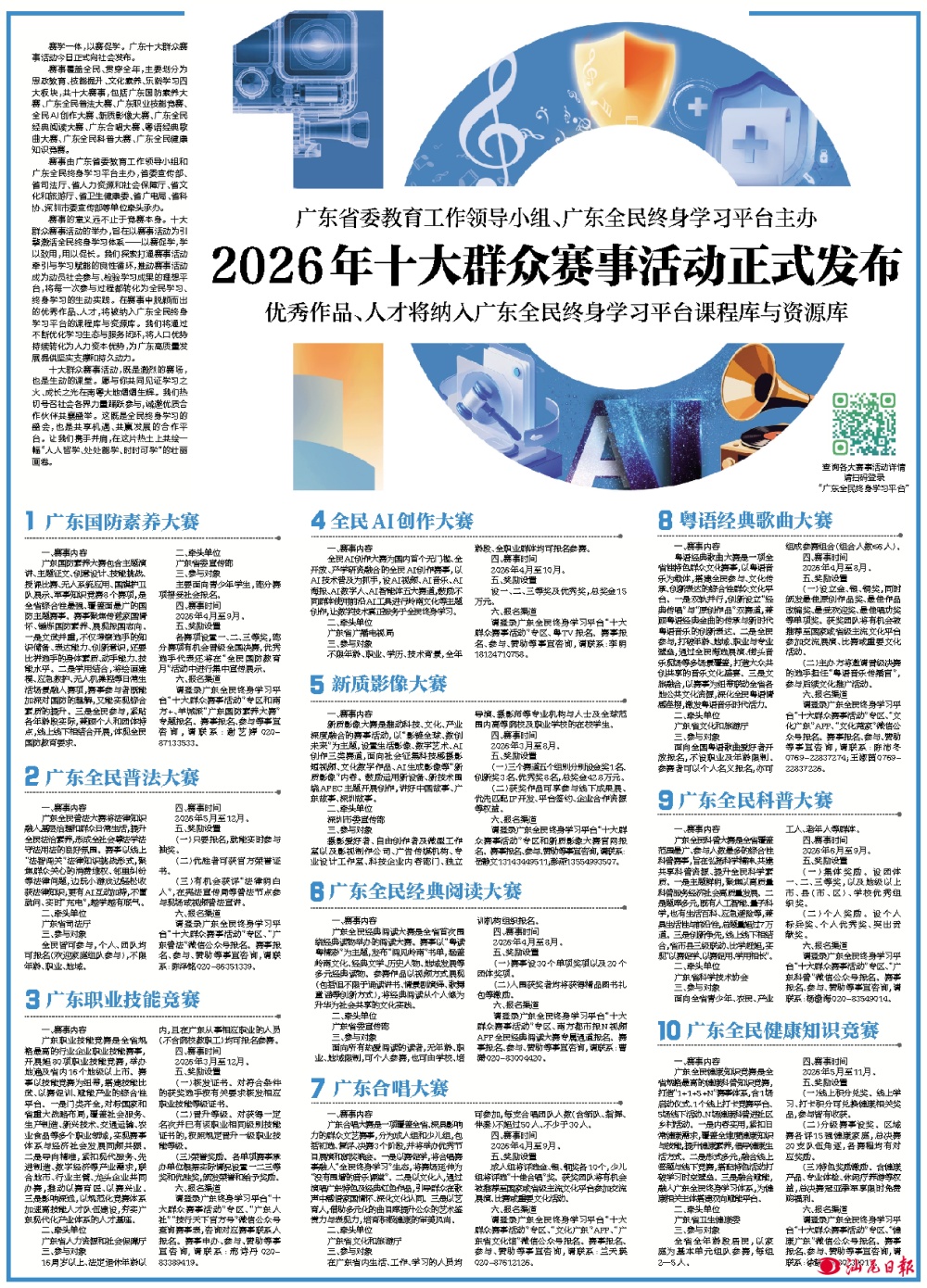 广东省委教育工作领导小组、广东全民终身学习平台主办 2026年十大群众赛事活动正式发布 优秀作品、人才将纳入广东全民终身学习平台课程库与资源库 1,774,460,489,000 c72d62cd5f904b4d867ccc5d9eb0a309