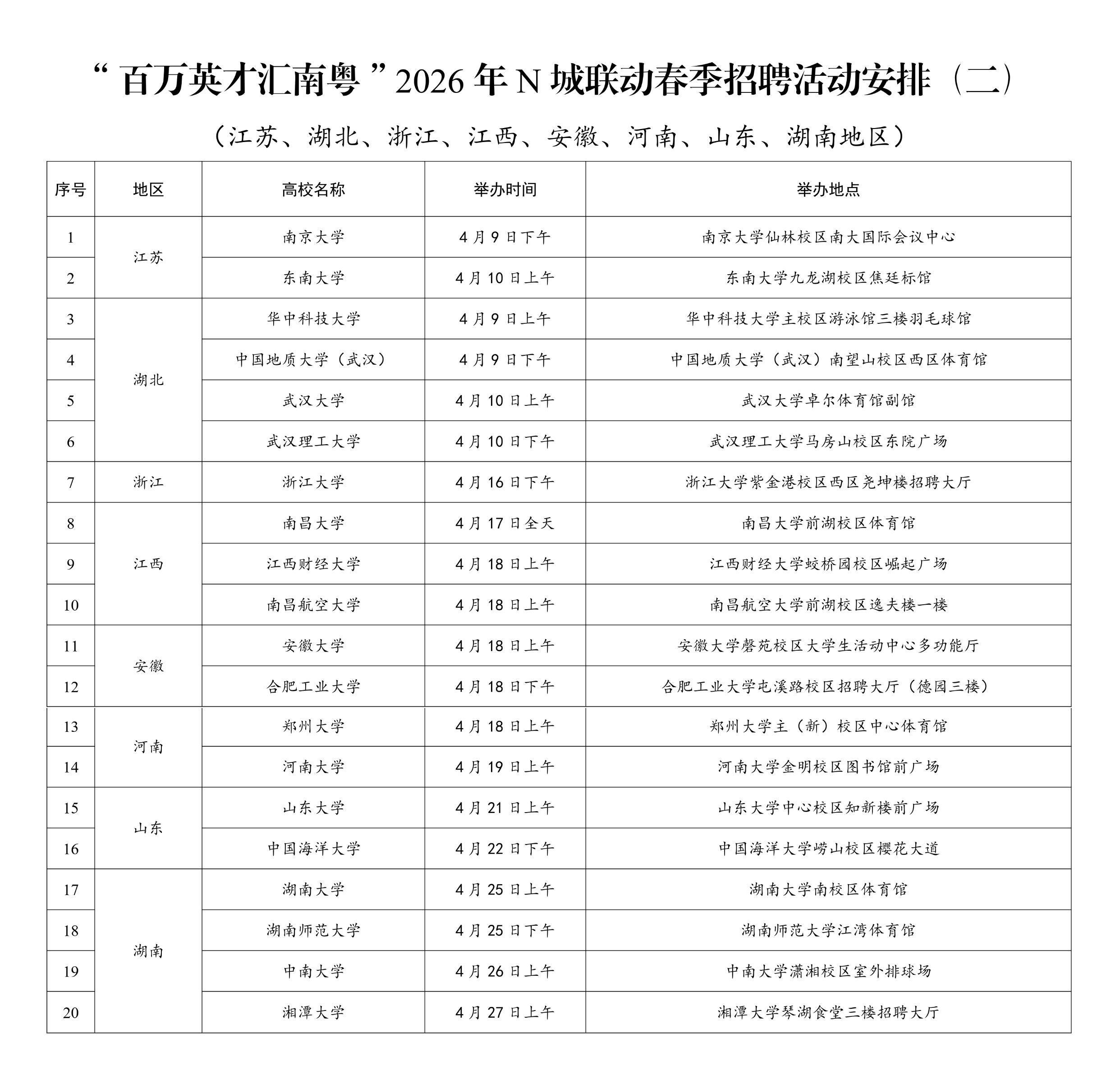 目前,活动已在北京、天津、上海三地10所重点高校铺开,4月将继续走进江苏、湖北、浙江、江西、安徽、河南、山东、湖南等8个省份的20所重点高校,邀约广大优秀高校毕业生与活力南粤共赴一场“春天之约”。活动将继续采用线上线下结合模式,在各重点高校举办校企对接会、专场招聘、政策宣讲等,涵盖集成电路、生物医药、低空经济、智能机器人等新兴支柱产业,为高校毕业生提供丰富优质岗位和就业选择。