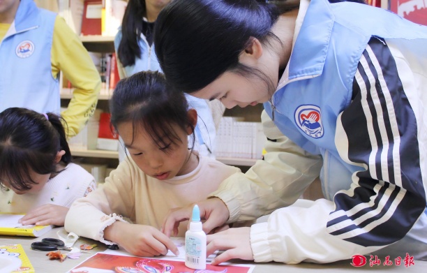志愿队队员在指导小朋友拼接“鱼鳞”。