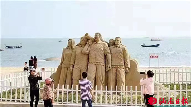 游客在金厢镇十二岗沙雕公园沙雕塑像前拍照留念。
