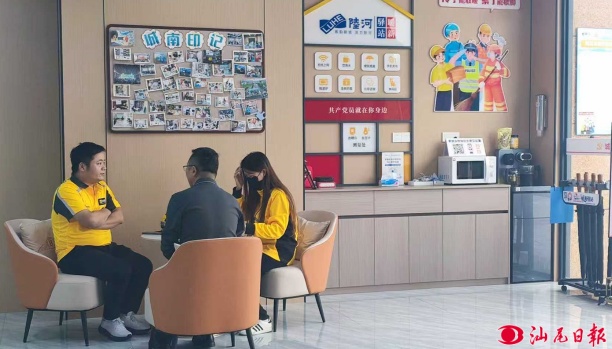 陆河县城南社区“暖新驿站”工作人员与新就业群体面对面交流。