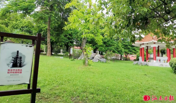 这是在华侨管理区拍取的一幅照片。镜头里是一处公园,它和其他公园一样有草地、凉亭等常见景物,但还设置写着法治标语的牌匾,这使得公园有了特别的内涵。成为法治宣传与文化休闲一体的法治文化园。