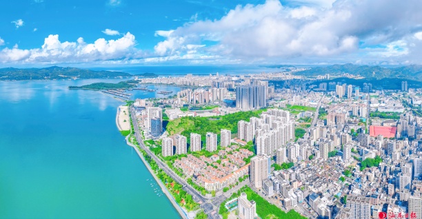 冬日里,航拍镜头下的汕尾品清湖畔,湛蓝海水与错落楼宇相映生辉。
