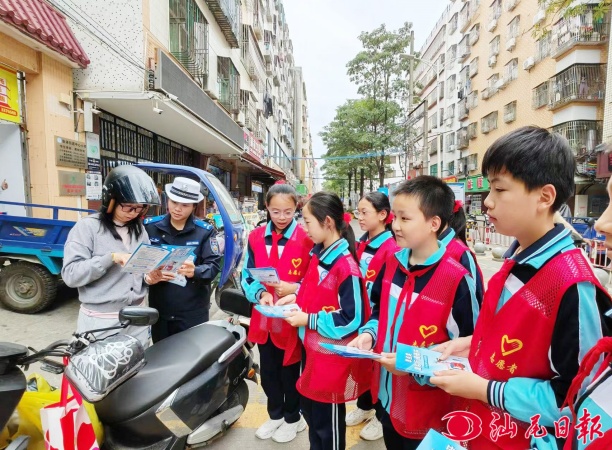 讲座结束后,交警支队还带领该校学生志愿者来到校园周边,向店铺经营者和接送学生的家长发放“早点走 慢慢行”交通安全宣传单。