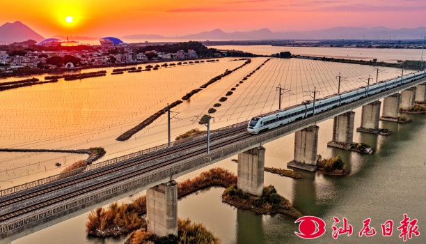 【大美汕尾】风驰电掣的高铁沐浴着晚霞,穿行于长沙湾,与连...