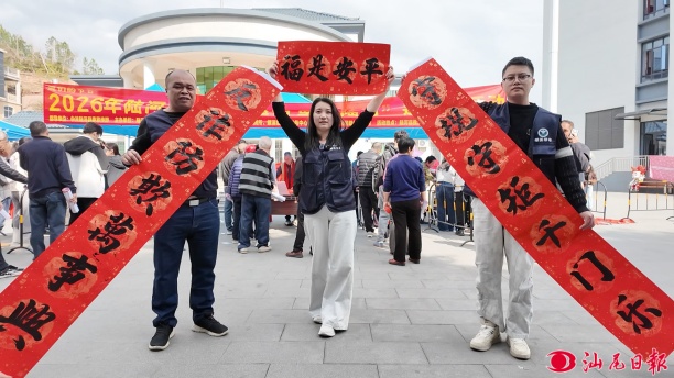 春节前,陆河县螺溪镇联合陆河县文学艺术界联合会共同举办“新春送福 墨润陆河”送春联活动,进一步丰富人民群众精神文化生活,营造欢乐祥和的节日氛围。图为送春联场面。