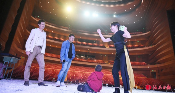 3月27日,中法合作音乐戏剧《小王子》在南宁上演。演员马克·普拉斯、中方导演张瑞、演员金珍禾、李一辰(从左至右)在演出开始前交流。