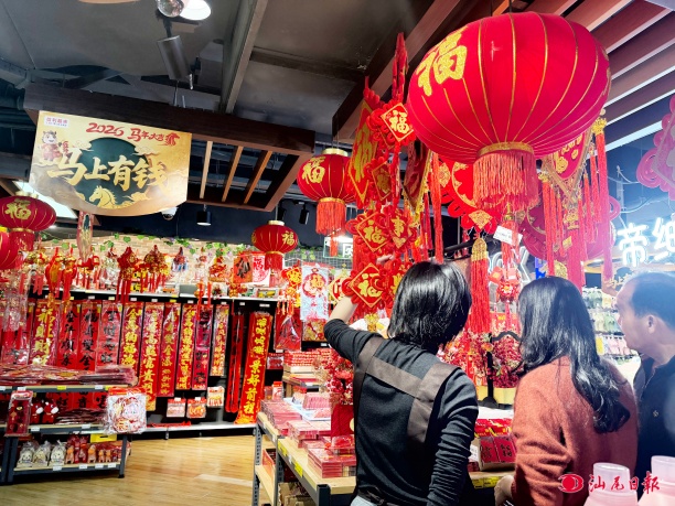 应节商品也是过年的必备品。在市区一家大型超市内,喜庆热闹的贺岁歌曲和红红火火的应节饰品传递着浓浓年味,记者明显感觉到临近春节的客流量比往日增加了不少。