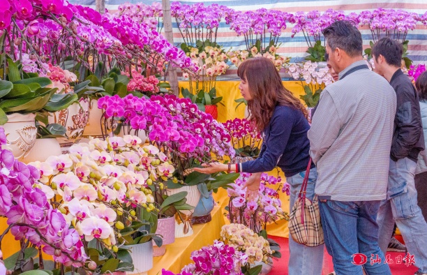 “花漾”年味必不可少。近期,市区出现了多处大大小小的迎春花市,花团锦簇将汕尾的暖冬点缀得更加美丽。记者走访发现,今年迎春花市花卉品种繁多,有较为常见的年桔、蝴蝶兰、冬青、水仙等。其中,蝴蝶兰除了有红、粉、白、黄等经典色系外,今年还有清新淡雅的蓝色品种。据一商家介绍道,蓝色的蝴蝶兰是今年的新品种,价格相对较高,一盆粉色与蓝色的双拼蝴蝶兰价格可卖到700元。