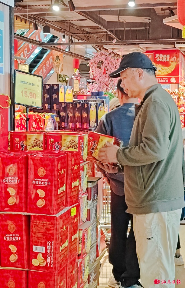 小零食用来招待客人,上门拜年则热衷于选择饼干礼盒、大桔等。一顾客经过一番精挑细选后,手里推着的购物车便收获满满。