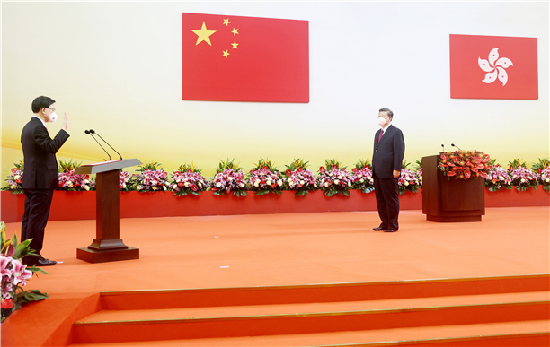 7月1日上午,庆祝香港回归祖国25周年大会暨香港特别行政区第六届政府就职典礼在香港会展中心隆重举行。中共中央总书记、国家主席、中央军委主席习近平出席并发表重要讲话。 新华社发