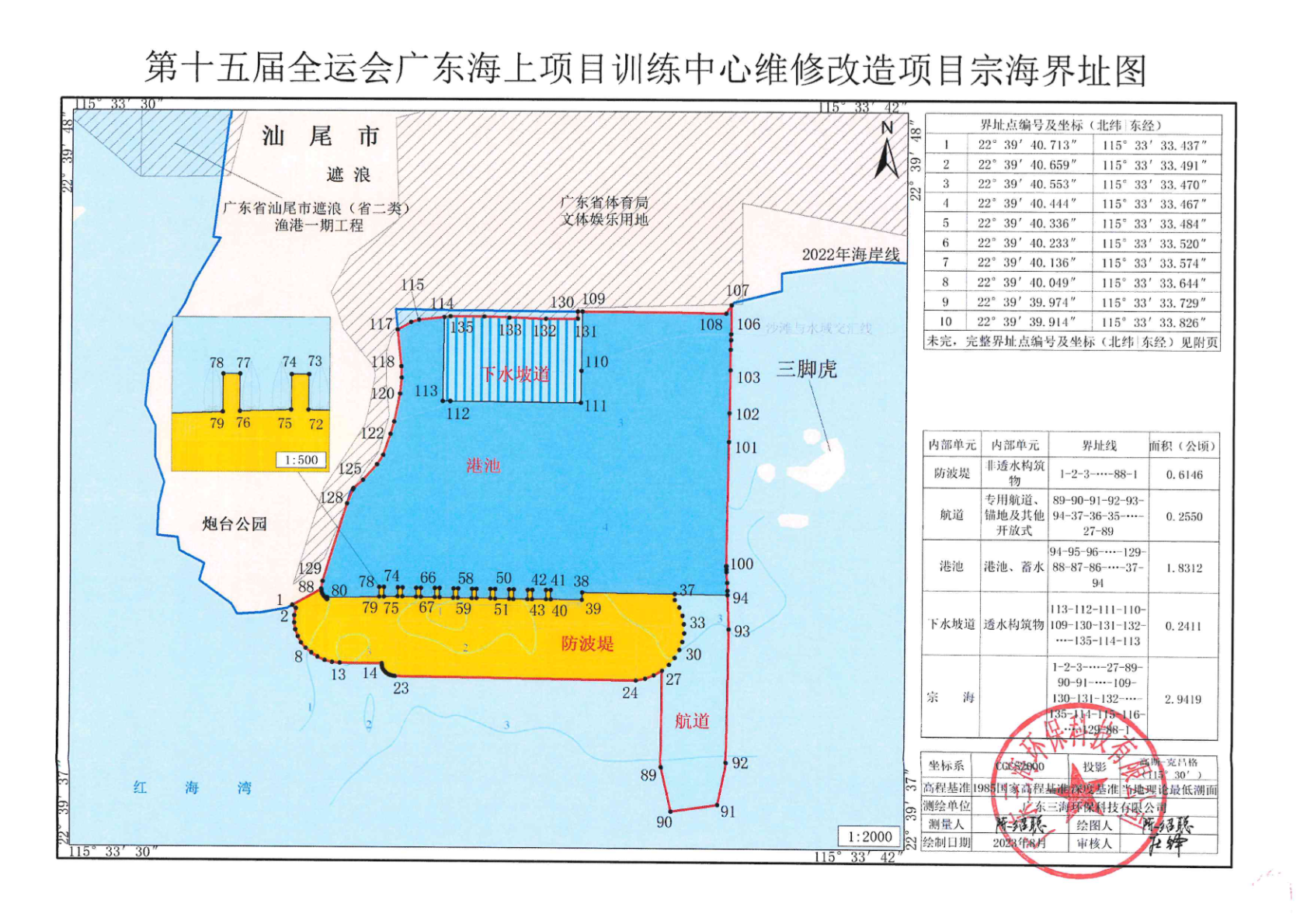 第十五届全运会广东海上项目训练中心维修改造项目申请用海总面积为2.9419公顷,其中防波堤用海0.6146公顷,下水道用海0.2411公顷,港池用海1.8312公顷,航道用海0.2550公顷。申请用海期限为40年。