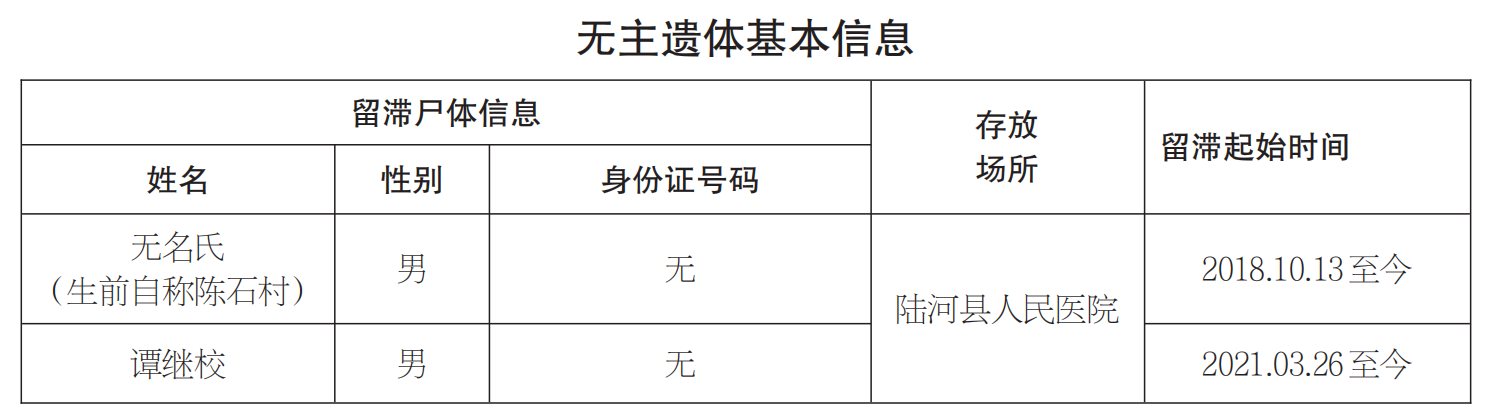 自公告发布之日起60个自然日内仍无人认领的遗体,陆河县人民医院将按《民法典》《殡葬管理条例》等相关法侓法规规定,依法申请卫生行政主管部门和公安机关将尸体处理。