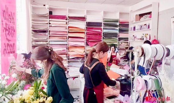 店员们在修剪整理花枝及打包。
